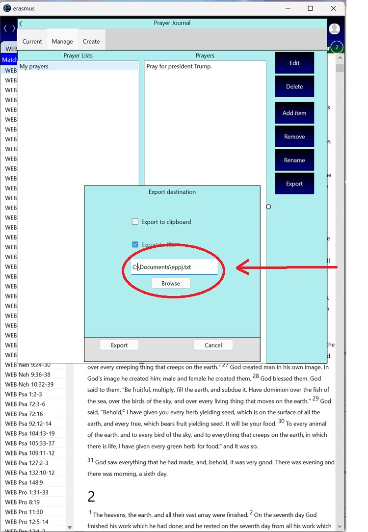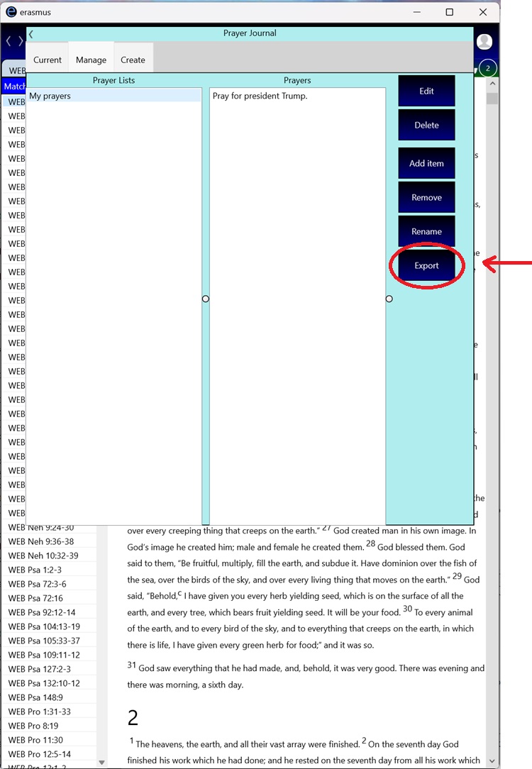 16. When you have completed your prayer list and are happy with it, export it to a file by pressing the "Export" button.