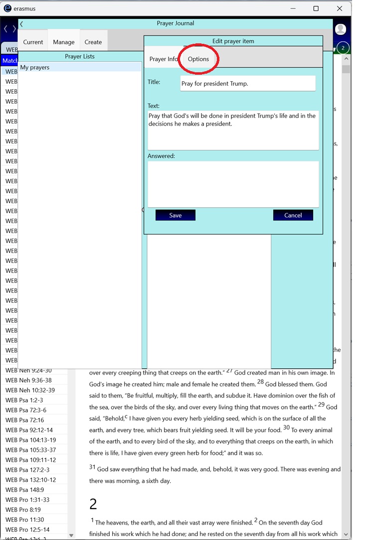 1. Create your list and prayer request items as above. However, while editing each request, after you've entered a title and text, click on the "Options" tab: